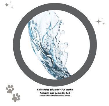 Förderung der Haut- und Fellgesundheit: Silizium unterstützt die Elastizität der Hautund kann helfen, trockenes Fell oder Hautprobleme wie Schuppen oder Ekzeme zu lindern. Es fördert die Zellregeneration und trägt dazu bei, das Fell deines Hundes glänzend und gesund zu halten.