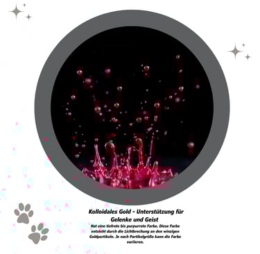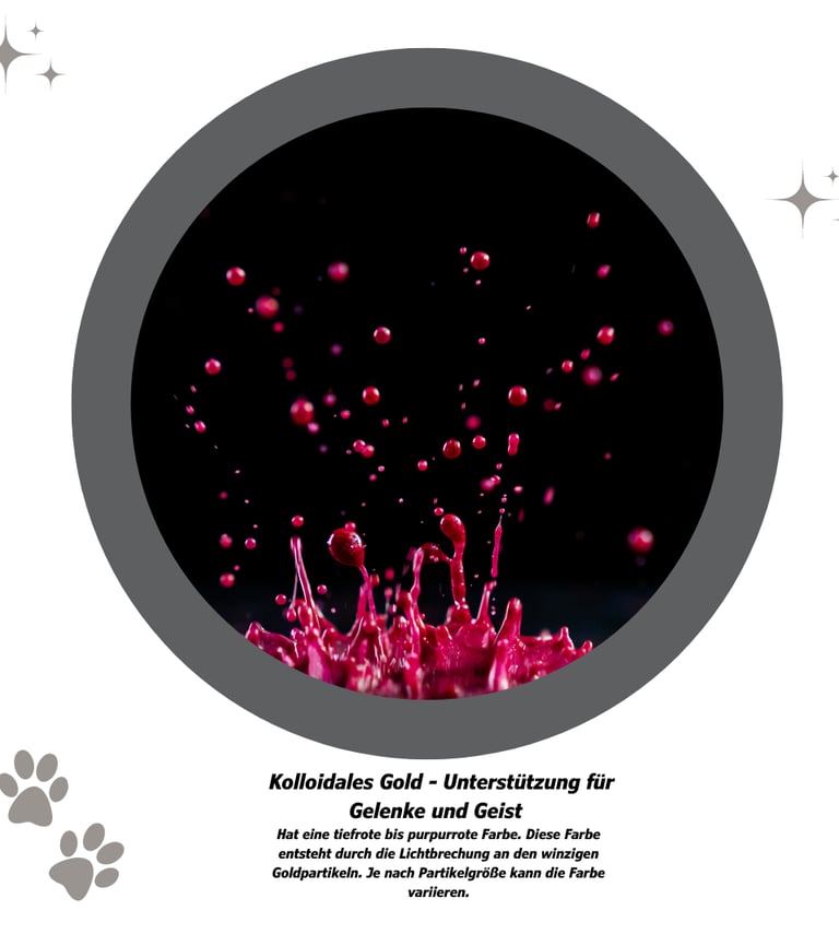 Anti-Aging-Effekte: Kolloidales Gold wird auch oft in der Anti-Aging-Therapie verwendet. Seine regenerativen Eigenschaften können helfen, die Zellgesundheit zu fördern und die Abnutzung des Körpers zu verlangsamen – besonders hilfreich für ältere Hunde oder Rassen, die anfällig für altersbedingte Beschwerden sind.