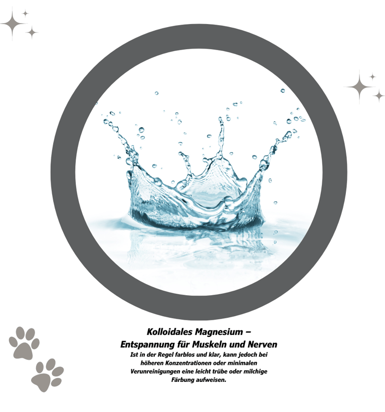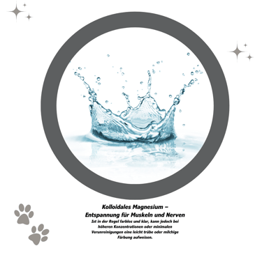 Magnesium ist ein essenzielles Mineral, das eine wichtige Rolle für die Muskelfunktion und das Nervensystem spielt. Bei Hunden ist Magnesium besonders dann von Bedeutung, wenn es darum geht, Muskelkrämpfe zu verhindern, die Muskeln zu entspannen und die Nerven zu beruhigen. Kolloidales Magnesium bietet eine hoch bioverfügbare Form, die vom Körper deines Hundes leicht aufgenommen wird und schnell wirken kann – ideal für Hunde, die unter Stress, Muskelverspannungen oder Nervenproblemen leiden.