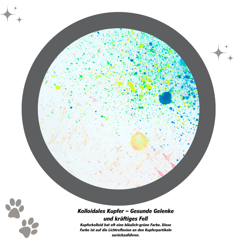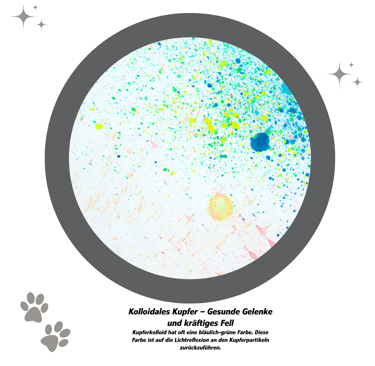 Anwendung: Kolloidales Kupfer kann innerlich verabreicht werden, indem es in das Futter gemischt wird. Für Hunde, die unter Haut- oder Gelenkproblemen leiden, ist die regelmäßige Gabe empfehlenswert, da der Körper Kupfer für die Kollagenproduktion benötigt.