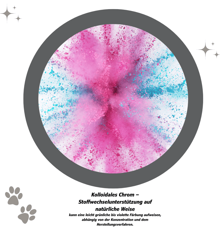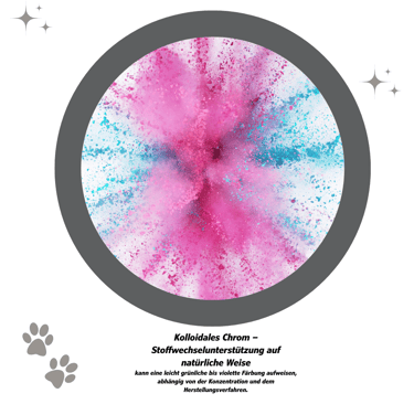 Stoffwechselunterstützung: Kolloidales Chrom hilft, den Stoffwechsel zu regulieren und die Verarbeitung von Fetten und Kohlenhydraten zu optimieren. Hunde, die Schwierigkeiten haben, ihr Gewicht zu halten, können von der regelmäßigen Gabe profitieren, da es dem Körper hilft, Energie effizienter zu nutzen.